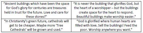 • Tell pupils the story of Christchurch Cathedral in New Zealand, a beautiful building destroyed in 2011 by an earthquake. What should the Christians of Christchurch do next? Should they rebuild ‘to the glory of God’ Ask children in 3s to speculate their designs for a rebuilt cathedral, then show them what was made – a very ecological and earthquake proof ‘cardboard cathedral’. In what ways is this ‘for the glory of God’? Information and pictures here: www.cardboardcathedral.org.nz/