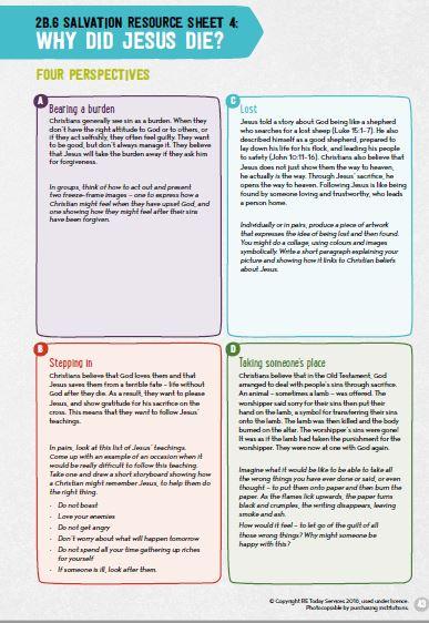 Take the information on Resource Sheet 4. Different groups could complete different activities and report back, or the activities could be experienced on a carousel. It might be helpful to talk through the ‘taking someone’s place’ activity as a whole class. You might ask pupils to draw a symbol on a piece of paper to represent something they have done and are sorry about, and then shred the paper (or, health and safety allowing, take the papers outside and burn them). Look at
